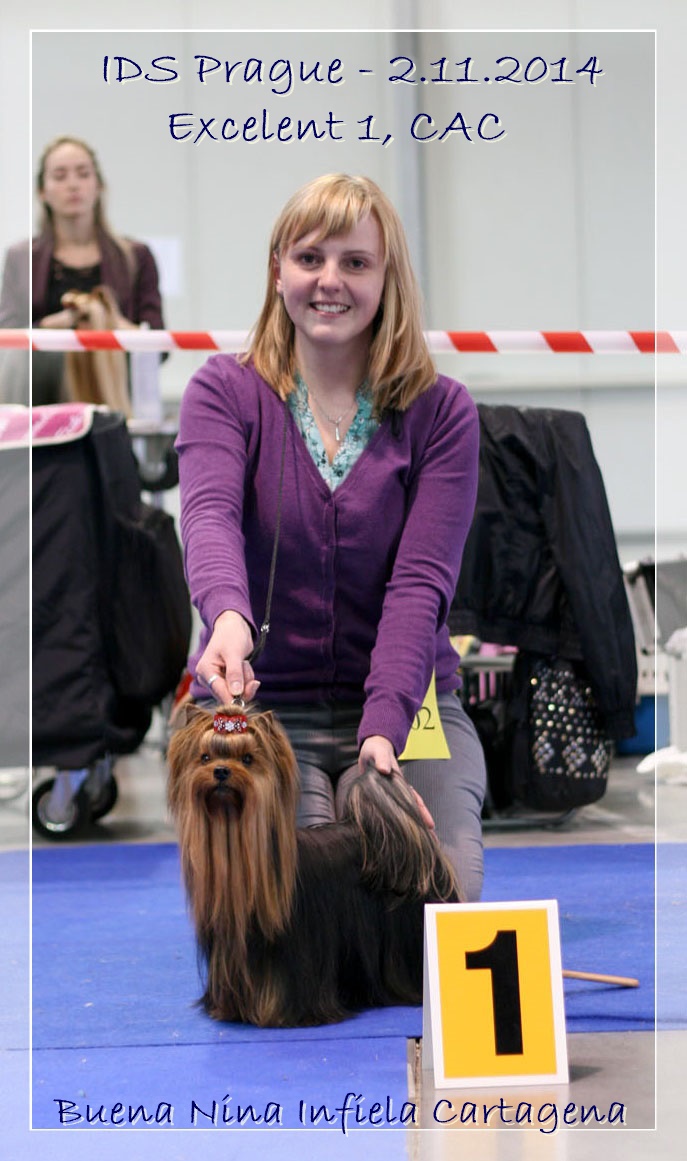 V neděli jsem jela s Ninuškou na Mezinárodní výstavu psů do Prahy. Byla to naše poslední výstava letos. Věděla jsem, že budeme ten den v nejpočetnější třídě, kde bude 6 fenek, tak jsem tam jela spíše na výlet. Čas utíkal rychle a přišla chvíle, kdy jsem měla nastoupit s Niňou do kruhu spolu se 4 fenkama (jedna fenečka nenastoupila, tak nás bylo nakonec 5). Posuzovala paní rozhodčí Naděžda Puchálková a byla velice pečlivá. Po velkém rozhodování, důkladné prohlídce na stole a chůzi v kruhu, začala paní rozhodčí rozdávat čísla s pořadím. Když jako poslední postavila jedničku před Ninušku, tak jsem byla šťastná jak blecha!!! Ninuška dostala krásný posudek a známku výborná 1 s titulem CAC. Povedlo se nám získat dvě výstavy po sobě titul CAC a tak je Ninuška v polovině čekatele na Českého šampiona. Potřebovala by ještě získat další dva CAC, jeden z mezinárodní a jeden z národní nebo klubové výstavy. Tak nám prosím držtě pěstičky pro štěstí, ať se v příští výstavní sezóně můžeme radovat z šampiona!!! :)